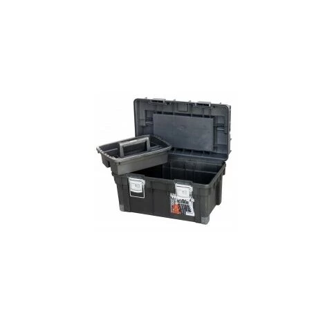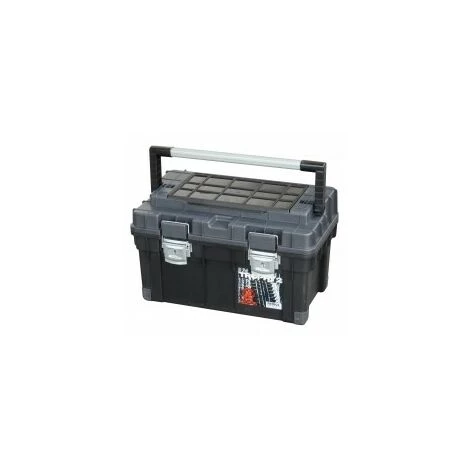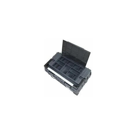 Boîte en polypropylène incassable. Grande contenance. Longue poignée en aluminium permettant de rattraper une charge mal équilibrée. Baladeur à outils et organiseur à 12 compartiments sur le couvercle. Crochets de fermeture métalliques. Boîte cadenassable.