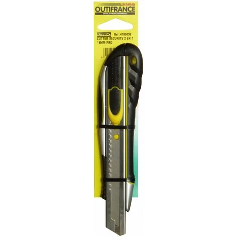 Corps ergonomique extra plat en alliage de zinc avec grip antidérapant, et fente « casse-lames » sur l’extrémité arrière. Cutter double fonction: -Cutter standard sur la partie arrière du curseur permettant de sortir et de maintenir la lame dans sa position -couteau de sécurité sur la partie avant du curseur permettant de sortir la lame qui se rétracte automatiquement dès relâchement.