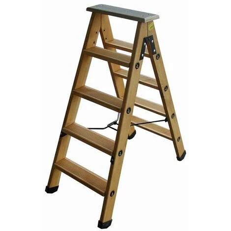 Escabeau à double plans de montée compas rigide, 4 marches + tablette. Tablette de travail antidérapante. Ferrure d’ouverture autobloquante en acier. Marches striées, interchangeables avec renfort métallique pour une plus grande rigidité. Traitement lasure extérieur. Norme EN 131.