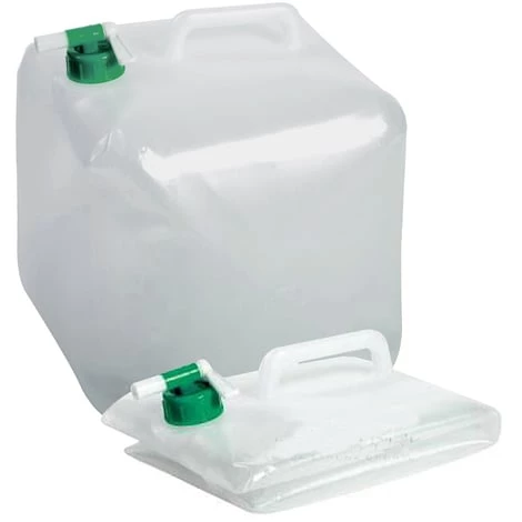 En plastique très résistant, avec poignée et bouchon à robinet. Se plie pour un rangement compact. Conforme aux normes de contact alimentaire.