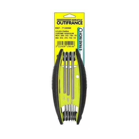 En chrome vanadium. Qualité Pro sur poignée ergonomique bi-matière. 9 clés : 5/64-3/32-7/64-1/8-9/64-5/32-3/16-7/32-1/4